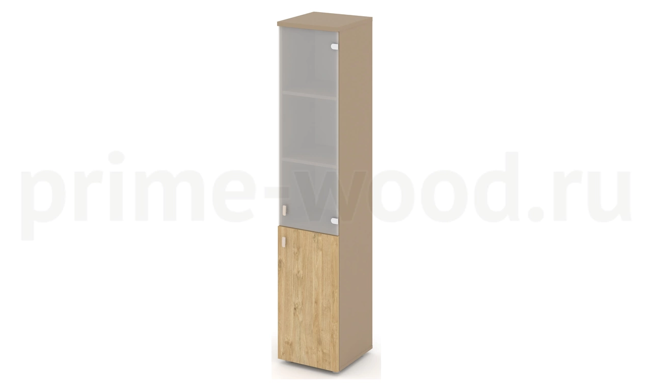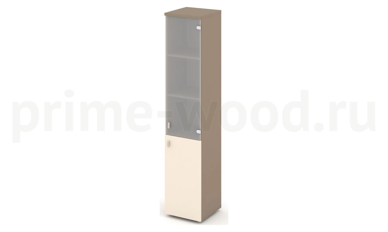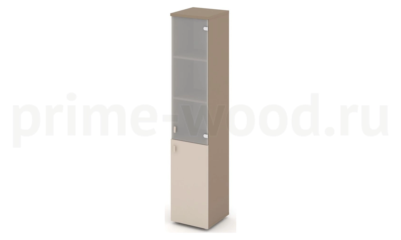 Шкаф высокий узкий правый (1 низкий фасад ЛДСП + 1 средний фасад стекло сатин матовый)